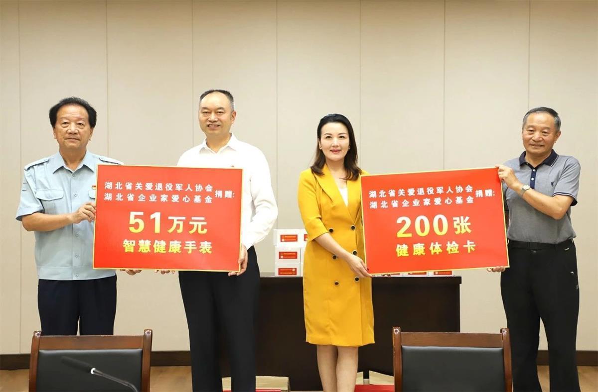 在9月18日当天活动中,省关爱退役军人协会副会长邝远平、省慈善总会副会长范红华、省企业家联合发展促进会副会长田少锋和爱心企业家黄娓娓,向徐申权等全国“最美退役军人”“荆楚楷模·最美退役军人”以及军休干部等100多名老党员,捐赠绿凯智能智慧健康手表170只、健康体检卡200张,总价值超过50万元。
