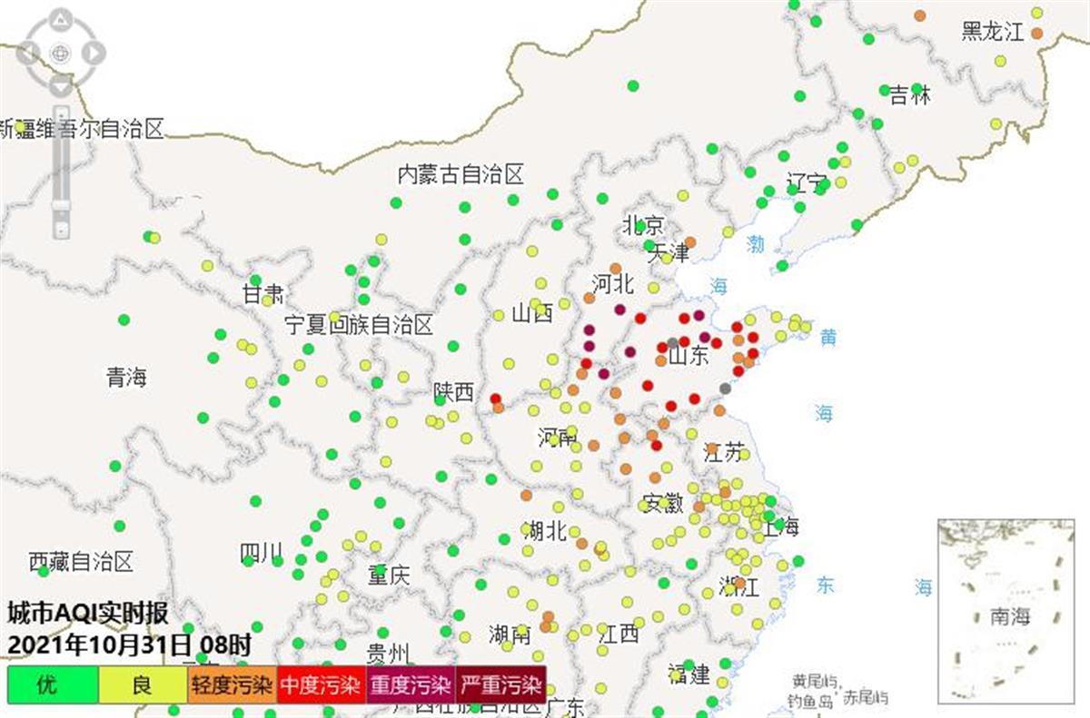 31日截至9时,城区空气质量指数为114,轻度污染,首要污染物为PM2.5。全国范围内,山东大部、河北南部部分城市为中度到重度污染;河南北部、安徽北部、湖南东部、江苏、安徽、浙江、黑龙江等个别城市为轻度污染,首要污染物为PM2.5;新疆个别地区为轻度污染,首要污染物为PM10。省内武汉、襄阳为轻度污染,其他城市空气质量为优良,首要污染物为PM2.5。