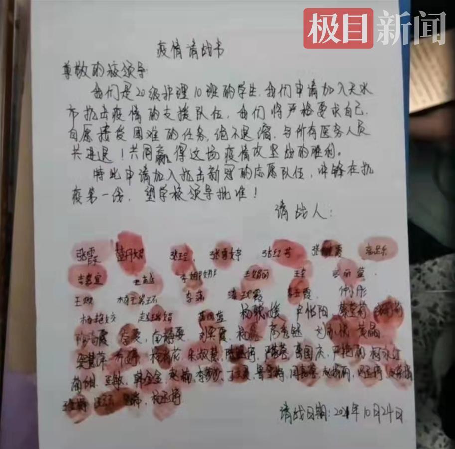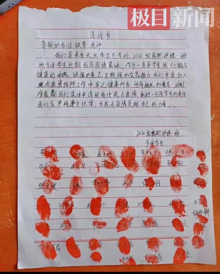 学生在请战书上签字按手印