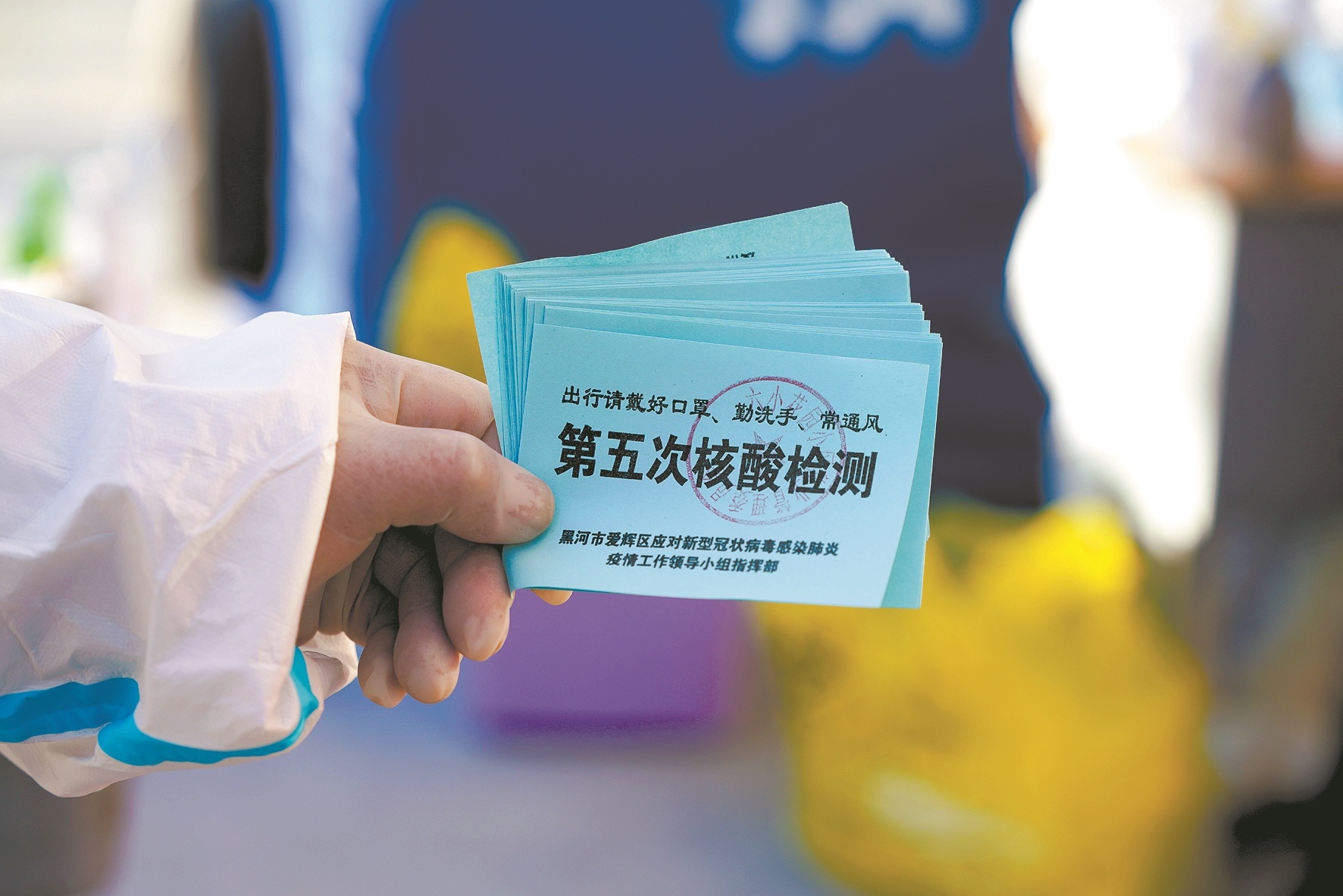 10月31日,黑河市防疫人员为市民发放检测凭证 新华社发