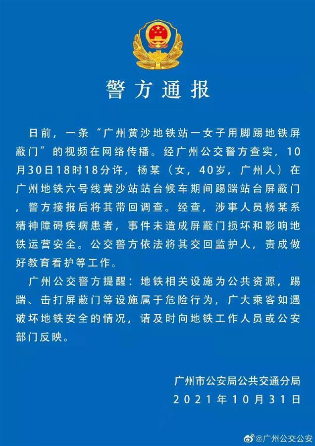 31日晚9时许,广州市公安局公共交通分局发布通报称,日前,一条“广州黄沙地铁站一女子用脚踢地铁屏蔽门”的视频在网络传播。经广州公交警方查实,10月30日晚6时18分许,杨某(女,40岁,广州人)在广州地铁六号线黄沙站站台候车期间踢踹站台屏蔽门,警方接报后将其带回调查。经查,涉事人员杨某系精神障碍疾病患者,事件未造成屏蔽门损坏和影响地铁运营安全。公交警方依法将其交回监护人,责成做好教育看护等工作。