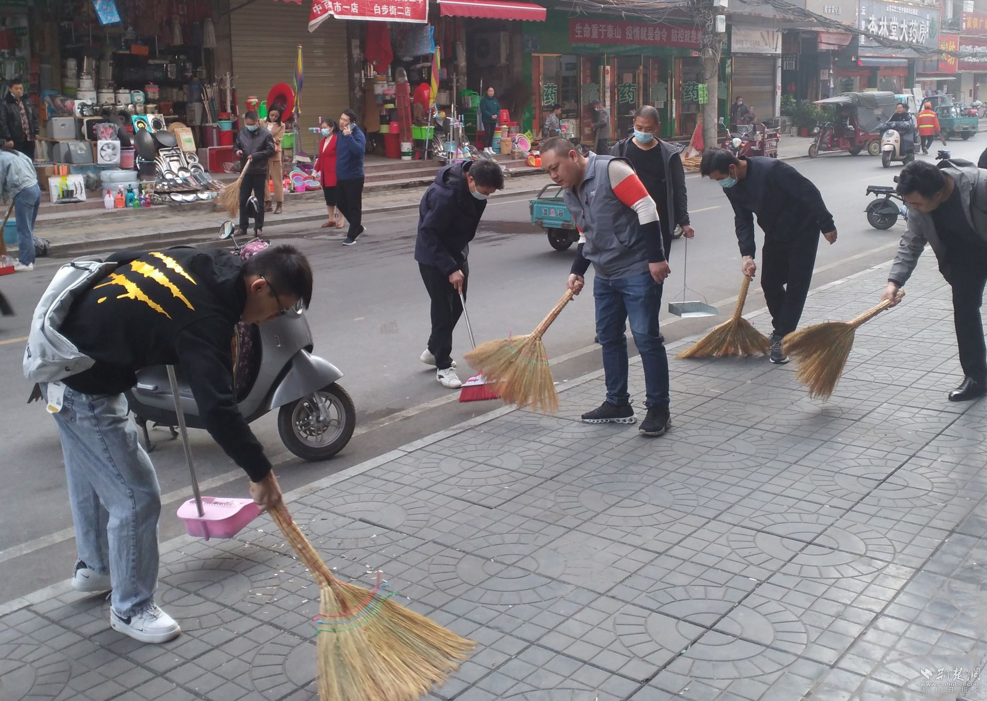 与会全体党员为民办实事,清扫街道。通讯员肖元玲 摄