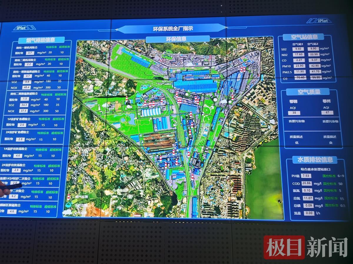 记者在鄂钢操业集控中心显示屏看到,鄂钢厂区空气质量(AQI)值为38,鄂州城区空气质量(AQI)值为67 ,优于城区。综合废水处理站排口的水质排放PH值、氨氮含量、总磷含量等指标,均在国控标准内。