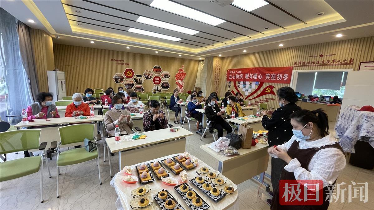 11月1日,武汉市武昌区徐家棚街水岸星城社区25位女性居民齐聚社区活动室,在志愿者的带领下,共同学习编织技法,编织手套。