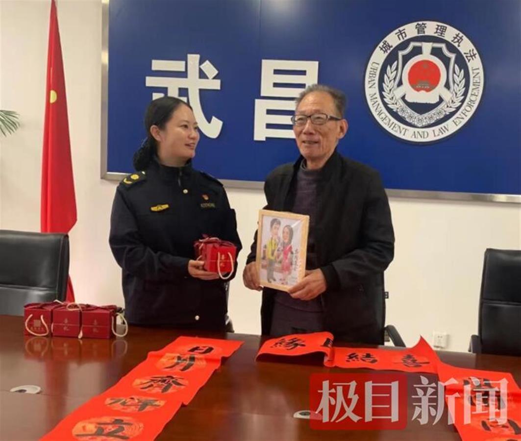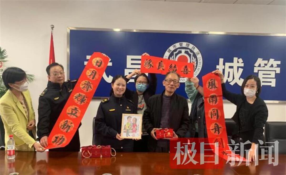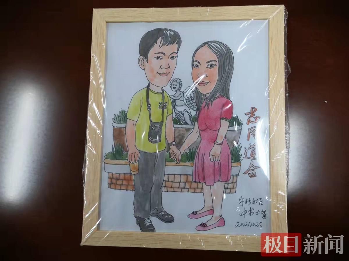画面中,小夫妻手牵着手,露出甜蜜的微笑,这是武昌区南湖宁松社区75岁的书画爱好者周平安老人,给一对推迟婚礼、下沉社区,同上战疫战场的一对新婚夫妻创作的一幅漫画。11月1日,老人亲手将漫画及对联送给“城管最美新娘”,祝福他们百年好合。