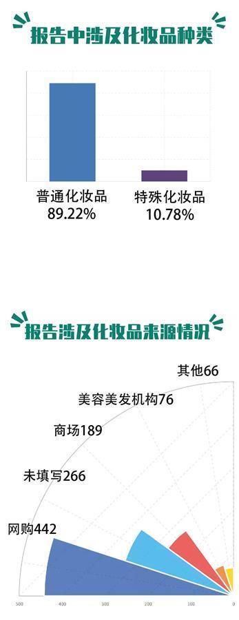 根据监测,2020年化妆品不良反应中,女性占比九成以上。21—50岁年龄段占比最多,说明化妆品重点使用人群为中青年女性。涉及化妆品类别1039种,普通化妆品中以护肤类为主;特殊用途化妆品以防晒类、染发类和祛斑美白类为主。其中网购产品442种,占比42.54%,其次是商场专柜购买189种,占比18.19%。