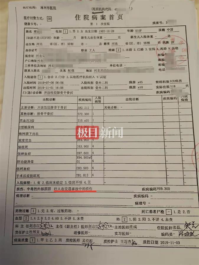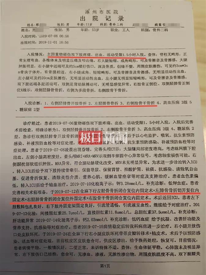 据邢华提供的一份出院记录显示,其父亲主因重物砸伤双下肢疼痛、出血、活动受限1.5小时入院,入院诊断为右侧胫排骨开放骨折、右侧股骨干骨折、左胫排骨骨折,还曾转入ICU治疗,并于2019年7月12日做了手术。住院病案显示,邢华父亲损伤的外部原因是行人在交通事故中的损伤。