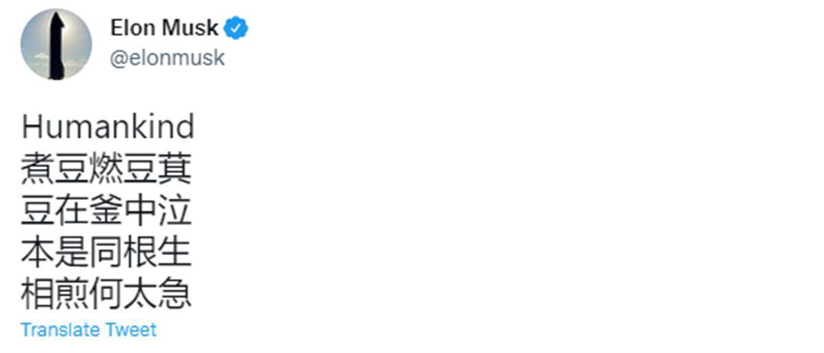 11月2日,马斯克突然在自己的社交媒体上发布了一首中国诗人曹植的《七步诗》,写道:“相煎何太急”,但在抬头上醒目地加上了Humankind(人类)这个词。这也是近年来马斯克首次在自己的账号上发中国古诗。