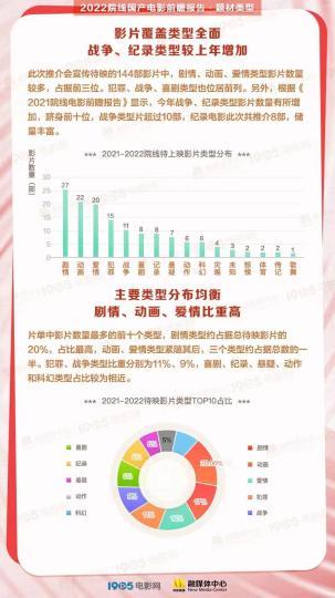 中新网北京11月2日电 (记者 高凯)由电影频道融媒体中心、1905电影网M大数据出品的《2022院线国产电影前瞻报告》日前发布。报告聚焦第二十一届全国院线国产影片推介会亮相的超140部院线优秀国产新片,从重要档期、影片阵容、创作趋势、类型风格等多维度对新一年的院线进行了分析展望。