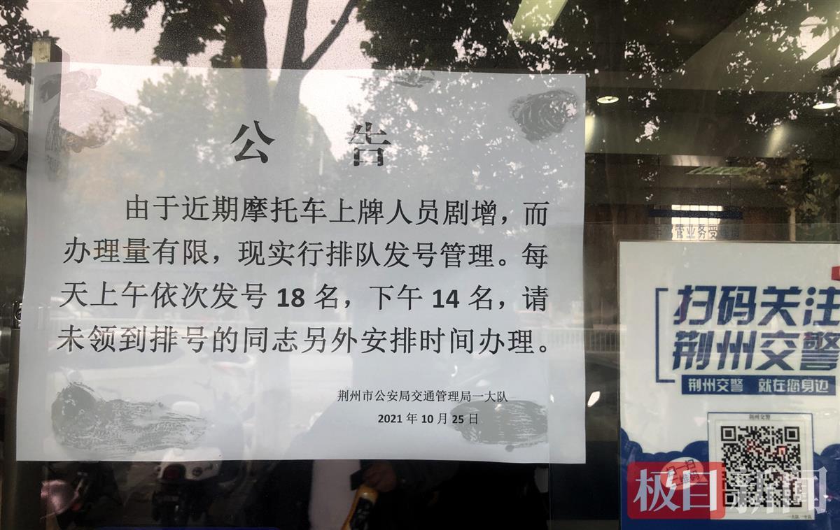 荆州交警一大队办牌办证服务大厅的排号公告。(极目新闻记者 黄志刚 摄)