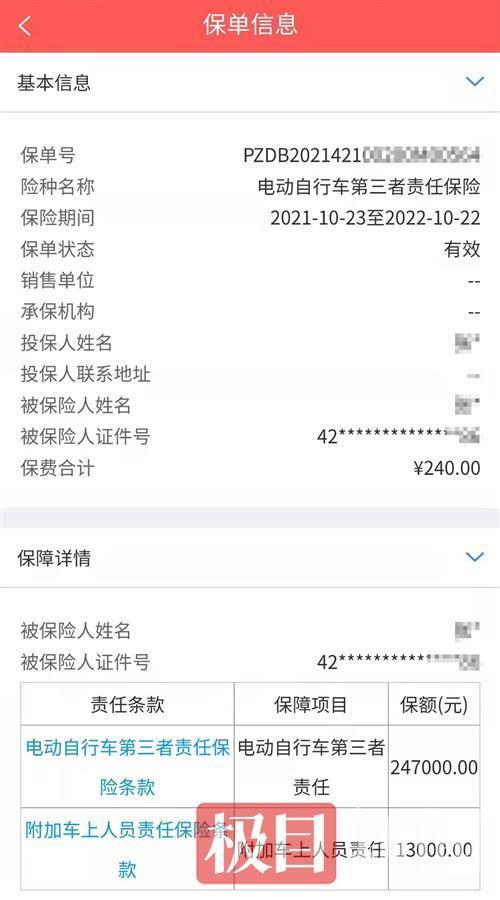 由于当天还有别的事情要处理,张女士无奈直接微信扫码,缴纳了240元,购买了电动自行车第三者责任保险、附加车上人员责任保险。