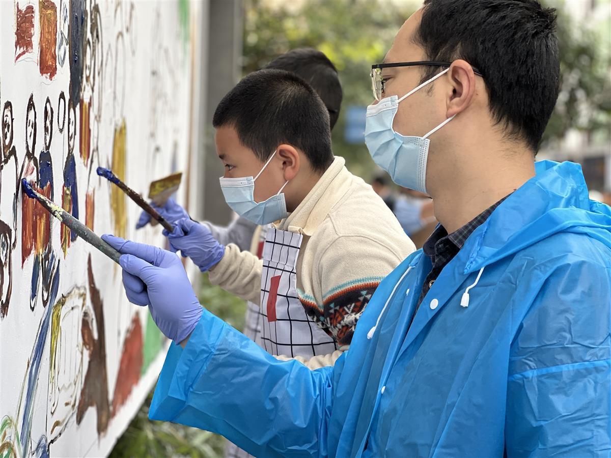 爸爸妈妈带着孩子一起拿着画笔在绘画墙上挥斥方遒,都感到很快乐,蘸取自己喜欢的颜色对着图片涂到相应位置。有的宣传板上画的是社区近期组织的精彩活动画面,让更多的居民朋友们更加了解社区活动,与社区建立了更紧密的联系。还有宣传板上画的社区工作者和志愿者们的抗疫画面,时刻提醒居民朋友们疫情防控不松懈,需戴好口罩,注意防护,看着最美志愿者的画面,感动着大家,吸引更多居民报名加入社区志愿队伍。