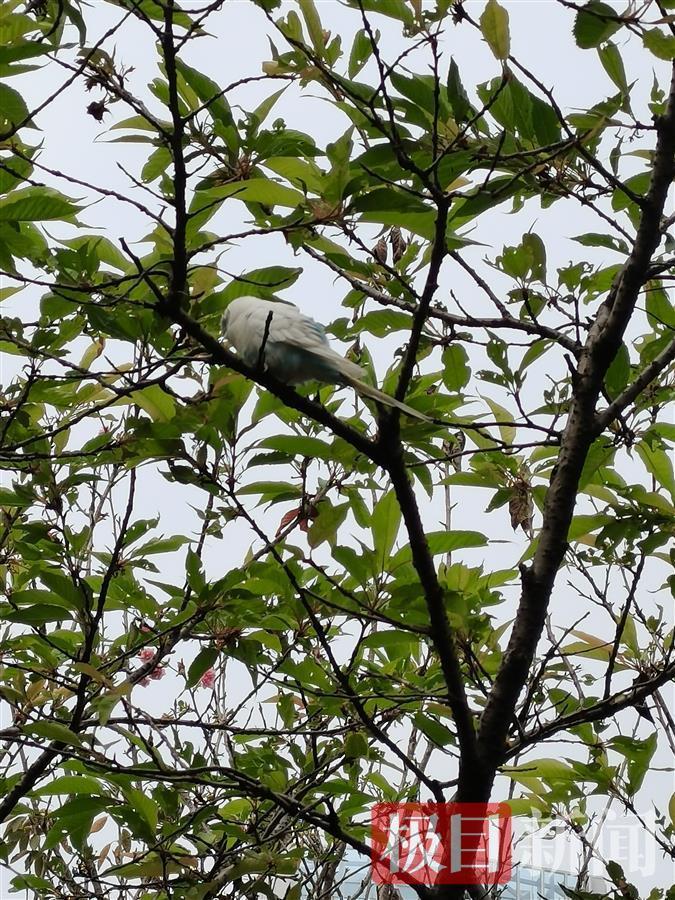 一只全身雪白带有些许粉蓝羽毛的鹦鹉落在武汉市青山区南干渠游园内,歇在树枝上觅食,引得不少小朋友争相拍照。园区管理处相关负责人告诉记者,这只小鹦鹉是一只家养虎皮鹦鹉,应该是一不小心飞来了。目前,这只鹦鹉还在园区内活动。园方表示,希望小鹦鹉的主人能快点发现它的下落,带它回家。