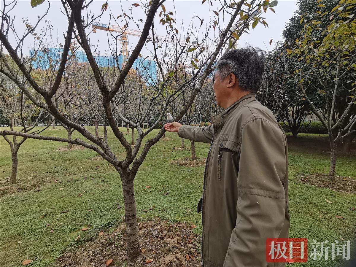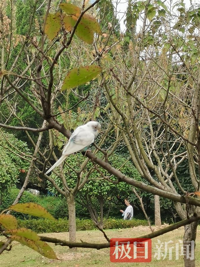 小鹦鹉飞到低矮的红枫枝头上,歇在上面觅食。园区相关负责人告诉极目新闻记者,这只小鸟一看就是家养的,为虎皮鹦鹉,可能是出来觅食的,雪白的身子上还有几片粉蓝的羽毛,十分俊俏可爱。
