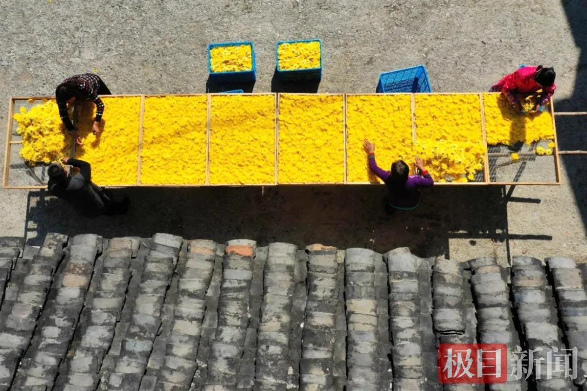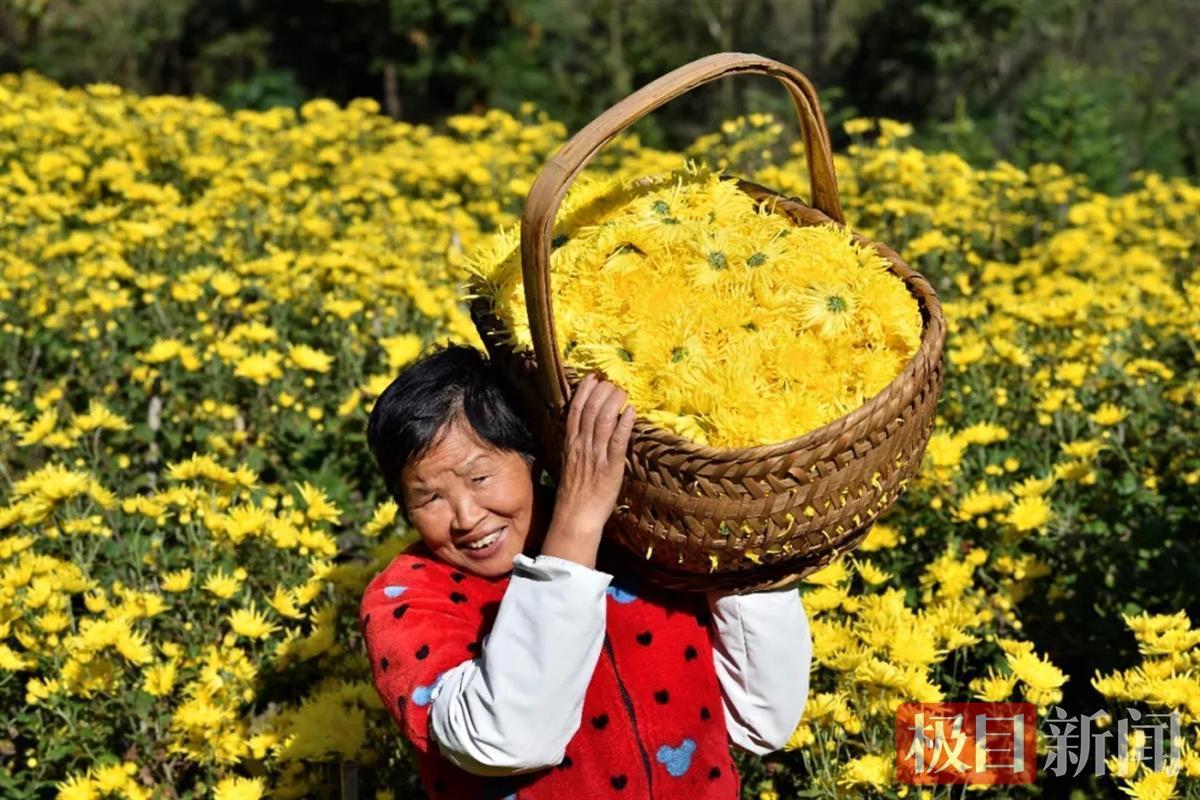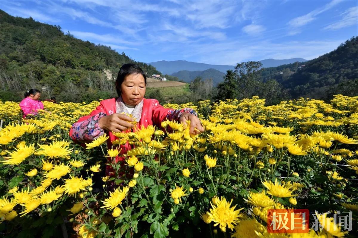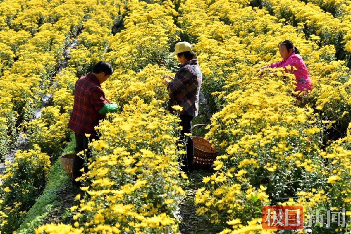 村民在菊花丛中采摘