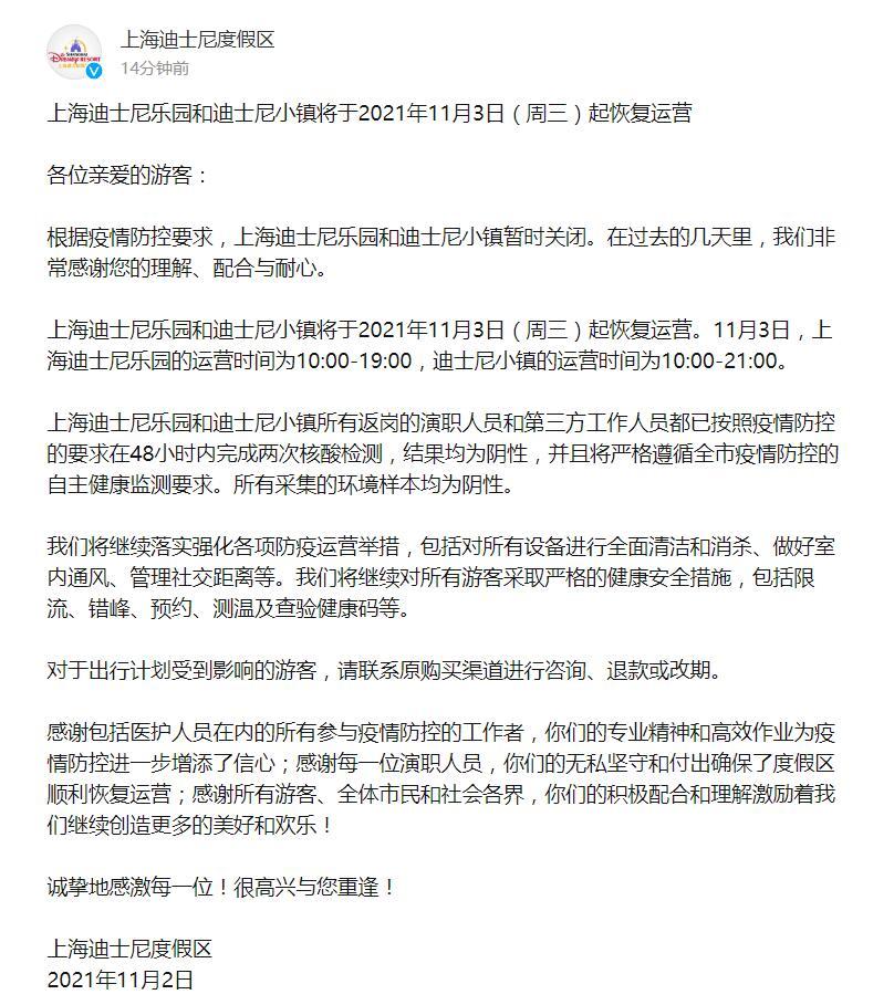 人民网上海11月2日电 (葛俊俊)上海迪士尼度假区刚刚发布通告:上海迪士尼乐园和迪士尼小镇将于2021年11月3日(周三)起恢复运营。