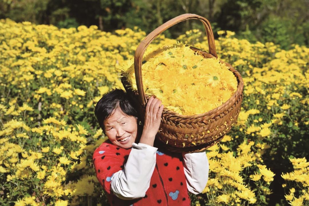 村民肩上扛着致富的菊花