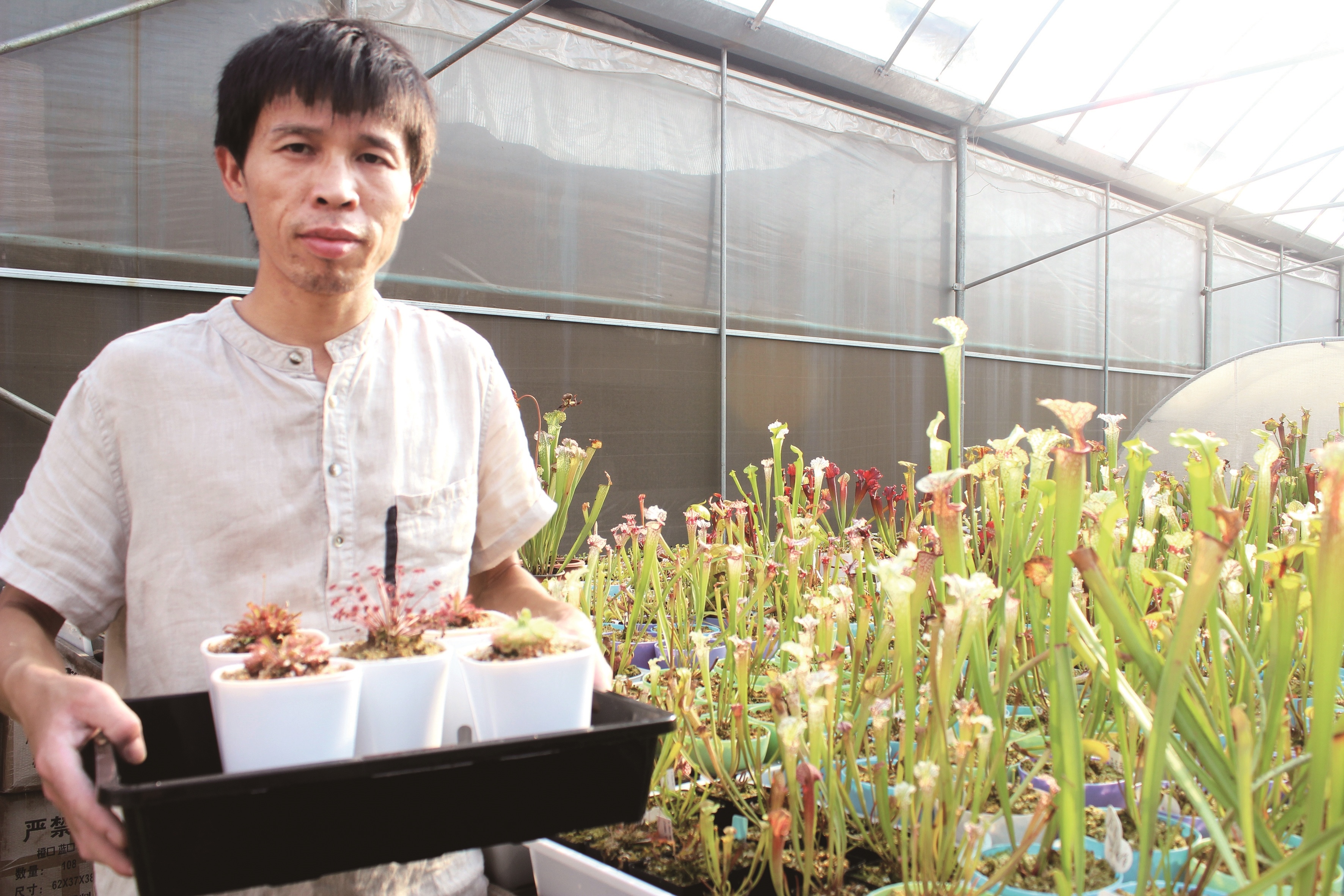 10月3日,武汉艳阳高照。阳光烤得塑料棚内炎热无比,食虫植物体验馆内的奇花异草却恣意生长,曹雨锋则在一旁,汗如雨下地忙碌。