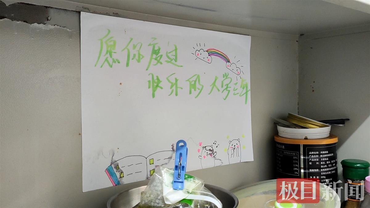 在寝室房门和书桌前的墙壁上,贴着几幅手绘图,写着“欢迎来到武交院”“很高兴认识你”“愿你度过快乐的大学三年”等祝福的话。汤紫妍说,这些是开学时帮她们打扫寝室的学姐留下的。