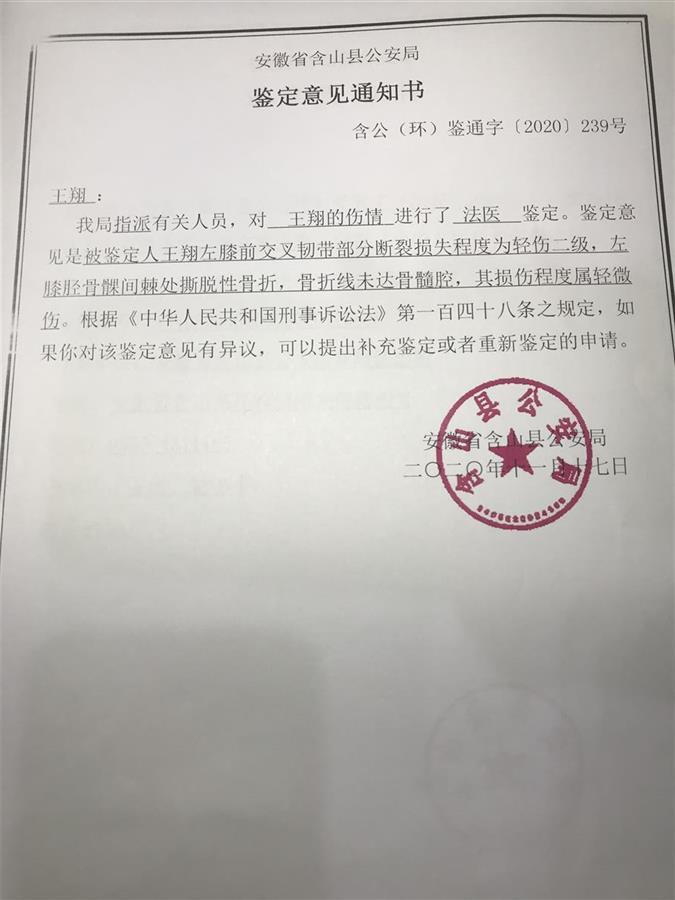 因“殴打他人”,王翔被含山县公安局处以行政拘留3日的处罚(暂未执行)。王翔先后向马鞍山市公安局、马鞍山市雨花区法院、马鞍山市中级人民法院等提起行政复议或诉讼,请求撤销处罚决定。2021年5月,马鞍山市中院做出裁定,撤销警方对王翔的处罚决定。2021年8月,含山县公安局对王翔作出不予处罚决定。