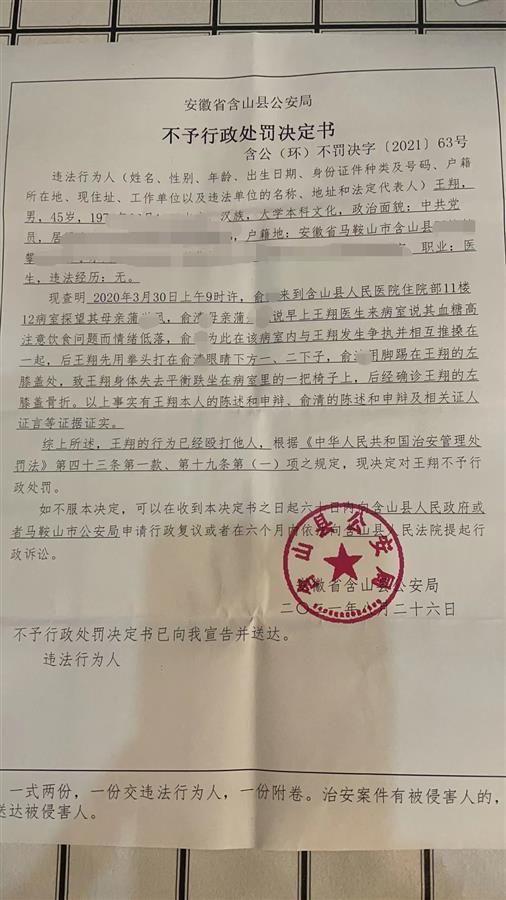 事发后,当地警方介入调查,认定双方行为属于互殴。2020年4月26日,含山县公安局对王翔作出行政拘留3日的处罚决定,理由是其“殴打他人”。同时,俞某也被处以行政拘留7日处罚。不过因疫情原因,两人的处罚都暂缓执行。