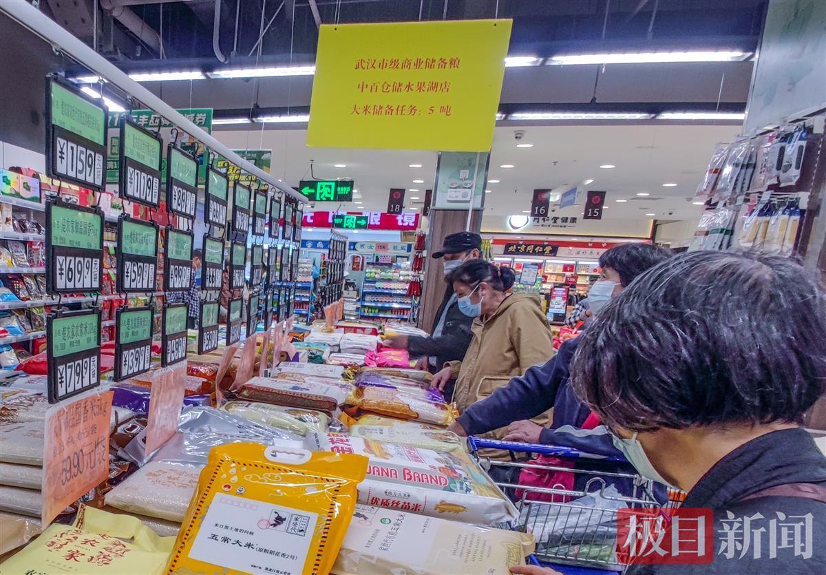 11月3日,在中百仓储武昌水果湖店,一个悬挂在大米销售区的“大米储备任务牌”引发不少市民的“兴趣”。 黄色的牌子上写着“武汉市级商业储备粮中百仓储水果湖店大米储备任务5吨”。