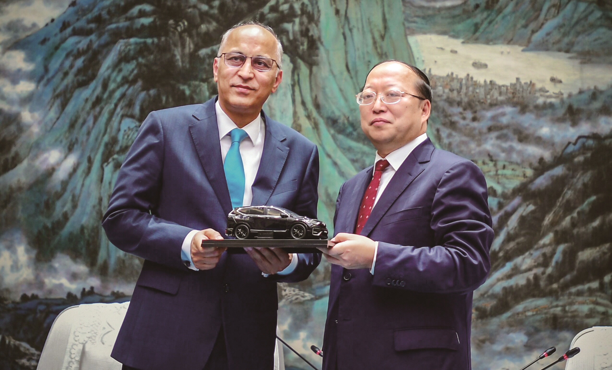 莫因·哈克大使(左)收到新能源汽车模型