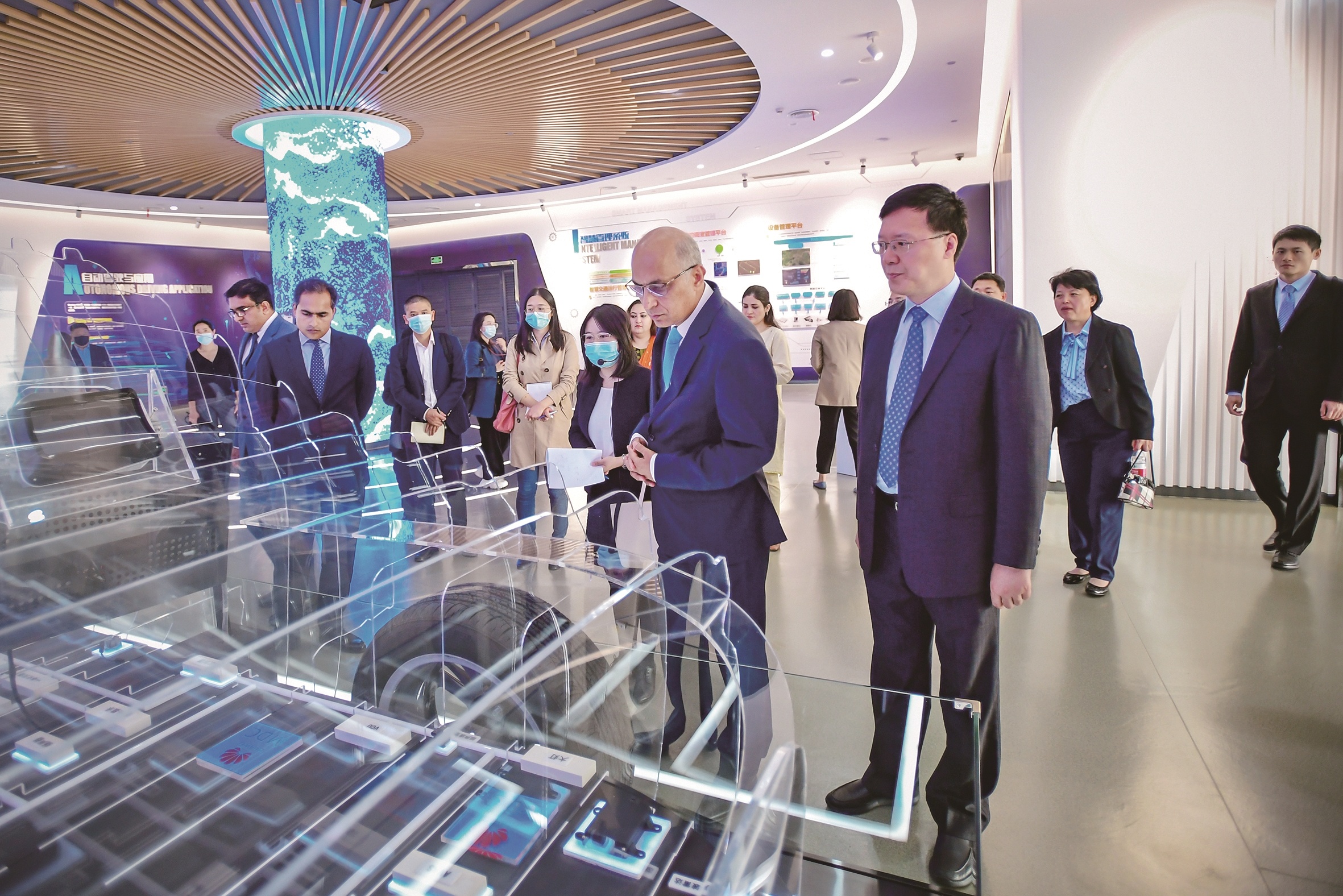 莫因·哈克大使(前左)参观武汉经开区智能汽车技术展示
