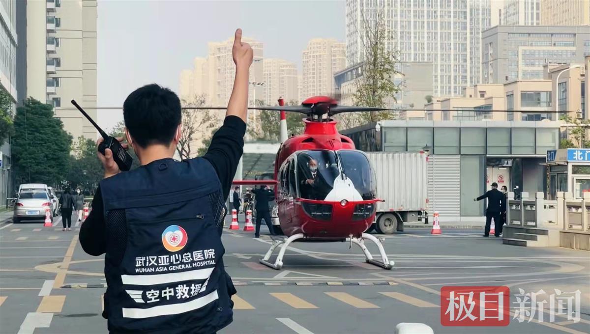 极目新闻记者看到,下午3时15分,随着盘旋的轰鸣声,一架橘红色救援直升机缓缓降落在武汉亚心总医院顶楼高架直升机场。医护人员立即冲上前,小心翼翼将担架从飞机中抬出,通过直达电梯将孩子送入儿科重症监护室。
