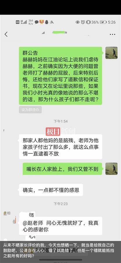 极目新闻记者在家长群中看到,赵老师在家长群内发布公告称:“赫赫妈妈在江油论坛上说我们虐待赫赫,之前确实因为大便的问题曾老师打了赫赫的屁股,后来特别后悔,还给他们家写了道歉信和保证书,现在又在论坛里说那些,如果我们真的像她说的那么不堪的话,那为什么孩子们都不走呢?”有家长则在群里说:“那家人都***脑残,老师为他家孩子付出那么多,就这么点事情一直逮着不放。”“确实,一点都不懂得感恩……”
