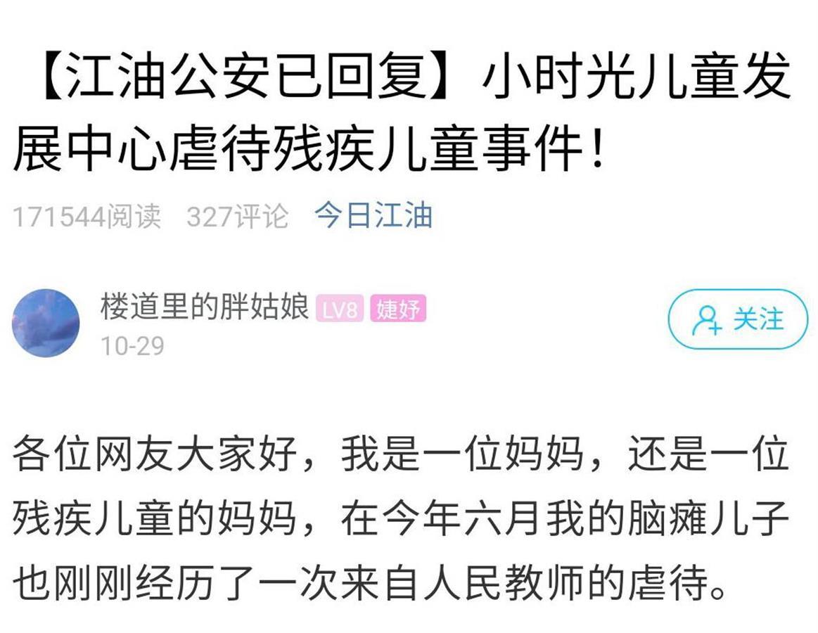 四川江油6岁残疾男童赫赫,在当地一家儿童康复中心接受康复训练时,被老师打屁股。孩子母亲何女士在网上讲述此事,遭到该中心其他家长的指责和谩骂,气愤难平的她于是再次发帖,请求有关部门严查涉事康复中心。