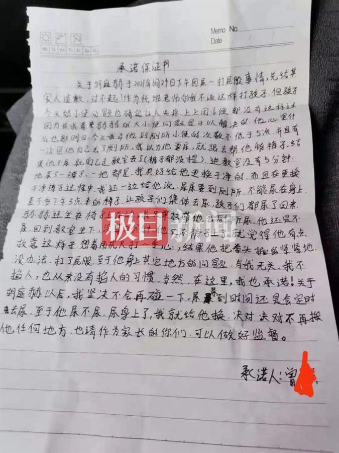 通过保证书,极目新闻记者了解到曾老师打赫赫的过程。当天曾老师多次带赫赫上厕所,但其中一次赫赫不撒尿,回教室没多久却尿了裤子,曾老师帮他换了裤子,还告诉他尿尿要到厕所去。下午3点半左右,曾老师又带孩子集体去上厕所,赫赫坐在座位上没动,等其他小朋友尿完他又尿了裤子。曾老师觉得赫赫是故意的,想用戒尺打他手心,但孩子紧握拳头,于是打了屁股。