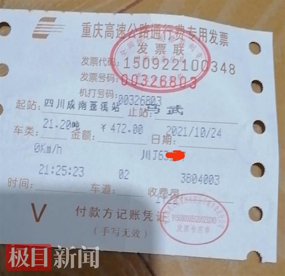 两辆车的缴费发票显示,10月24日,霍师傅的车从四川成南蓬溪站上高速,至马武站下高速,车辆总重21.20吨,收费472元。霍师傅同事的车,也是从同样的站点上下高速,车辆总重24.40吨,收费却是406元。两车下高速的时间都在当晚9时25分左右。