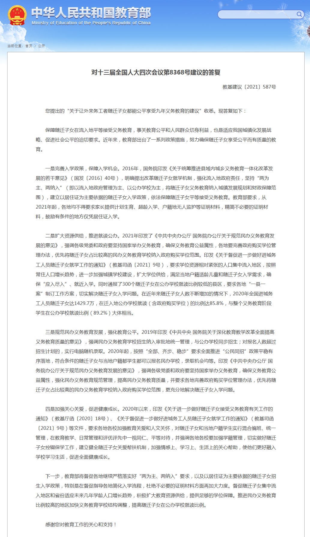 近日,教育部网站公布对十三届全国人大四次会议第8368号建议的答复。针对“关于让外来务工者随迁子女都能公平享受九年义务教育的建议”,教育部答复称,教育部要求从2021年起,各地均不得要求家长提供计划生育、超龄入学、户籍地无人监护等证明材料,精简不必要的证明材料,鼓励有条件的地方仅凭居住证入学。教育部称,教育部将督促各地继续严格落实好“两为主、两纳入”要求,以及以居住证为主要依据的随迁子女招生入学政策,特别是在督促指导各地简化入学流程,杜绝不必要的证明材料方面再加大力度。