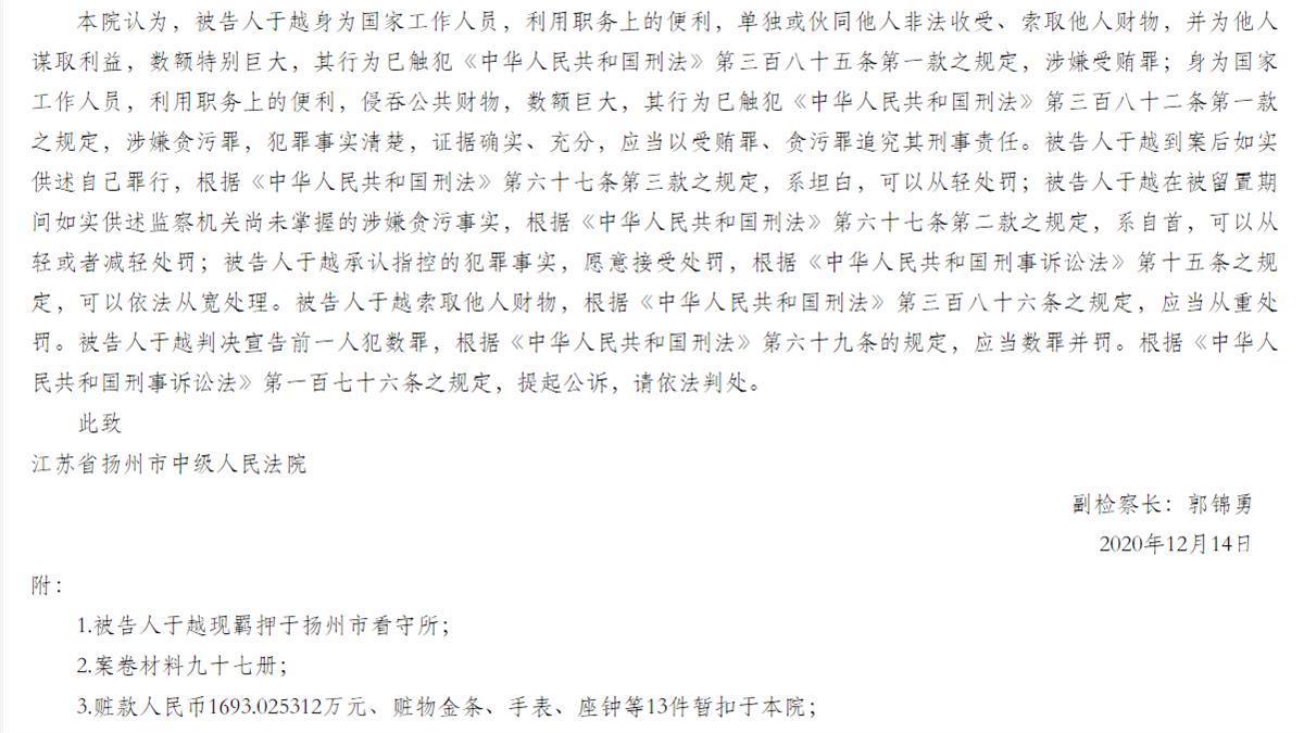 江苏省扬州市人民检察院认为,于越身为国家工作人员,利用职务上的便利,单独或伙同他人非法收受、索取他人财物,并为他人谋取利益,数额特别巨大,其行为已触犯《刑法》,涉嫌受贿罪;身为国家工作人员,利用职务上的便利,侵吞公共财物,数额巨大,涉嫌贪污罪,应当以受贿罪、贪污罪追究其刑事责任。