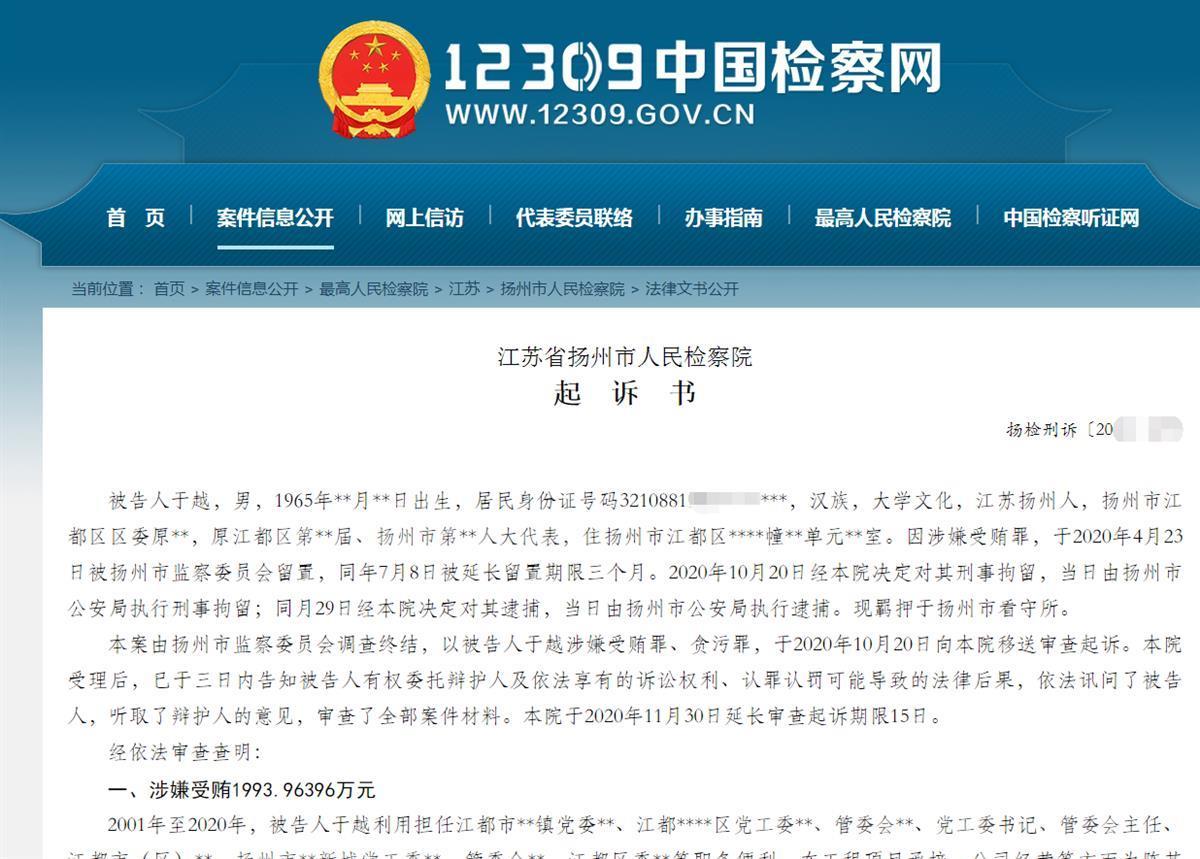 从2001年至2020年长达19年时间里,扬州市江都区委原常委于越在不同的职位上持续贪污受贿,总金额高达2239万元。11月3日,中国检察网公布了对于越的起诉书,透露了这名原正处级干部的贪腐记录。