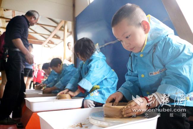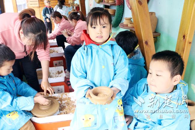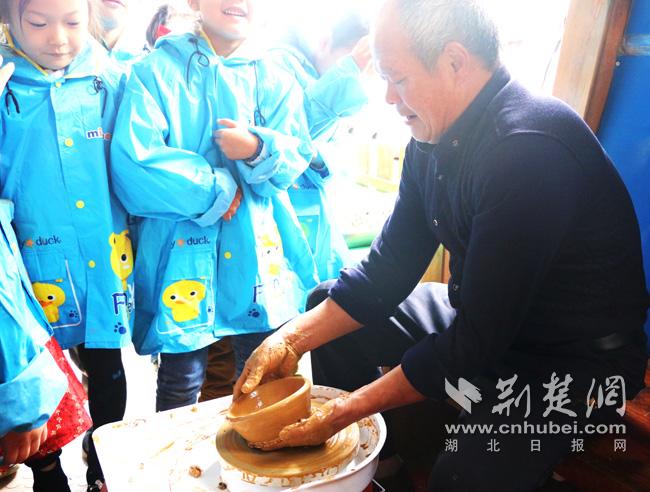 荆楚网(湖北日报网)讯(通讯员 吴远清 孙龙 许光泽)11月1日下午,丹江口市浪河镇中心幼儿园陶艺坊泥水飞溅,笑语喧天。均陶非物质文化遗产传承人吴远德现场手把手地教孩子们制作均陶。师傅教的细致,娃们学的认真。