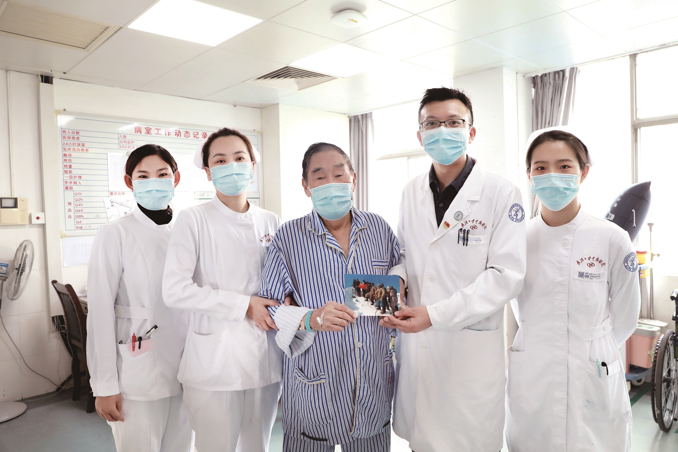 “谢谢中南医院医护团队!谢谢你们治好了我!”11月4日,在武汉大学中南医院关节与运动医学科病房,86岁的陈山向医护人员们竖起大拇指,为他们点赞。随后他拿出一张照片,作为礼物赠送给医护人员,寄语大家继续勇攀医学高峰。