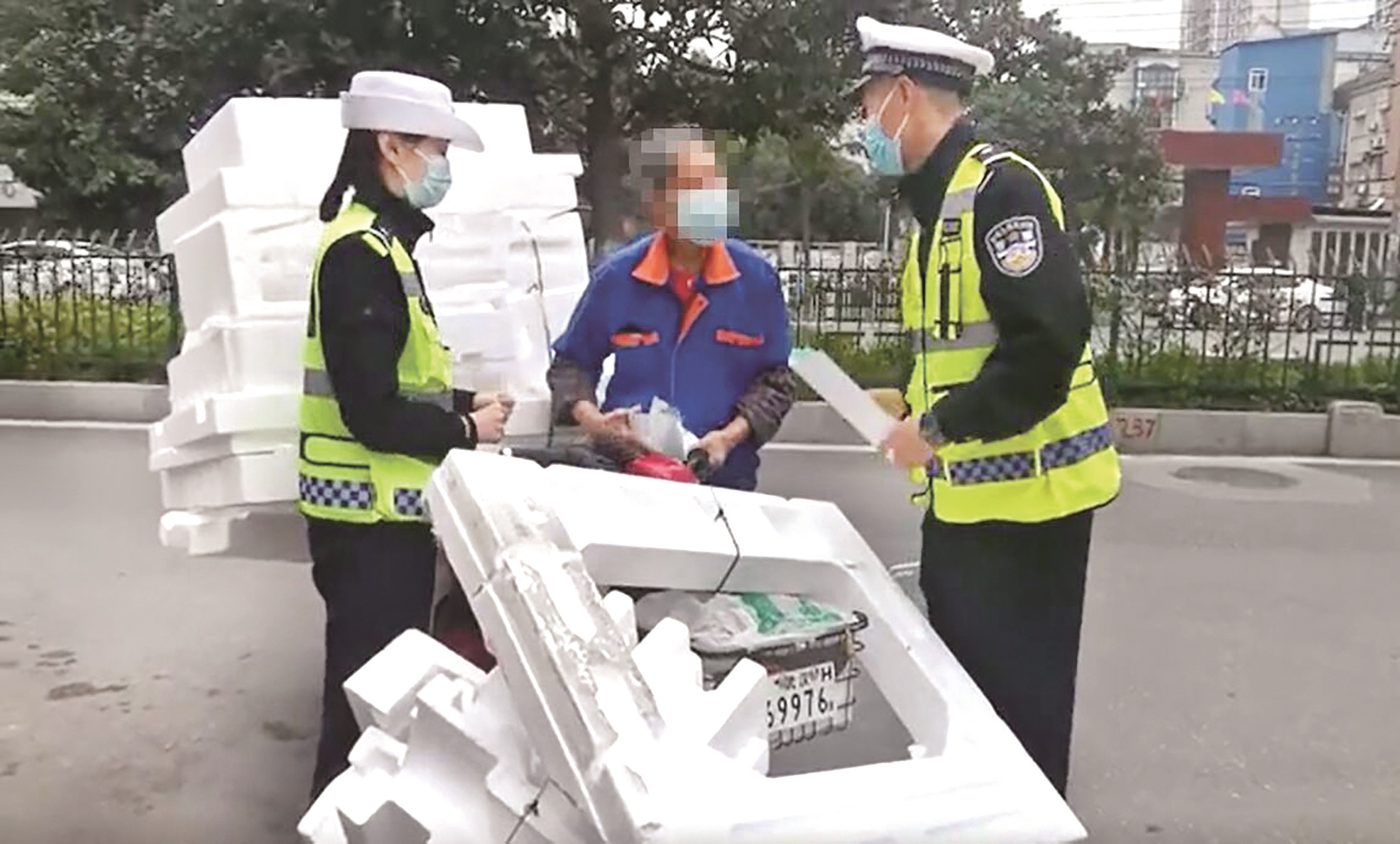 上午11时50分许,在辽阳街鑫宏基建材城附近,民警发现一名女子正骑着电动自行车晃晃悠悠地行进,女子没戴头盔,车头、后座上都绑着一大堆泡沫板,后座的泡沫板堆积成小山,目测高度已超过1.7米。“这多危险啊!”民警见状,立即将女子拦下。女子脸色显惭愧,民警考虑到她对电动自行车行驶规范不太了解,依法对其进行了批评教育,向其发放宣传单,叮嘱她现场整改、回家后认真研读。“我回去一定好好学习,下次绝对不违规载物了。”女子认真盯着宣传单承诺。