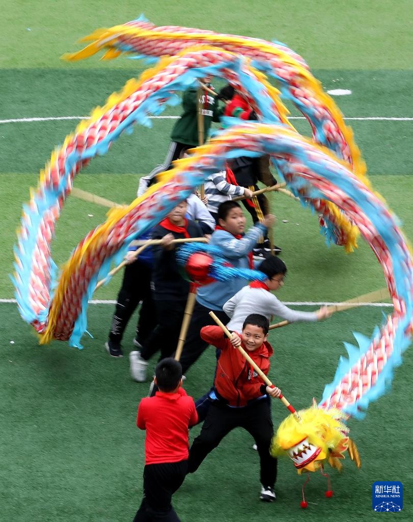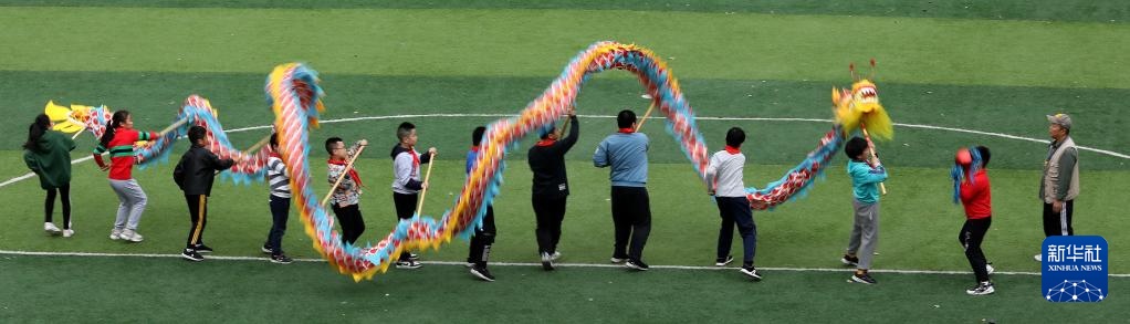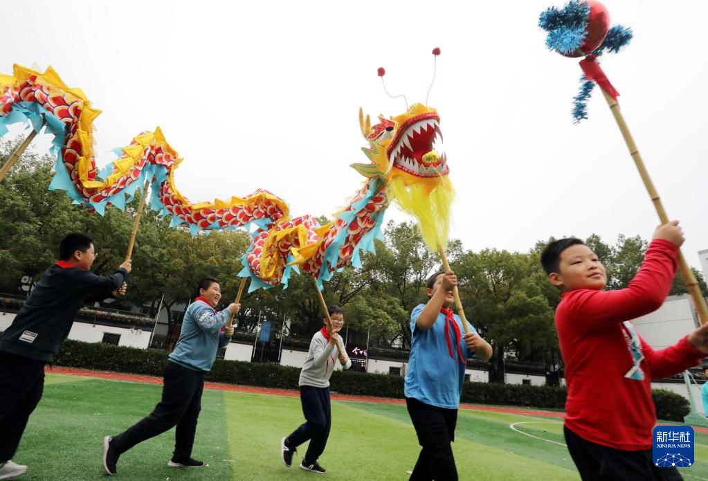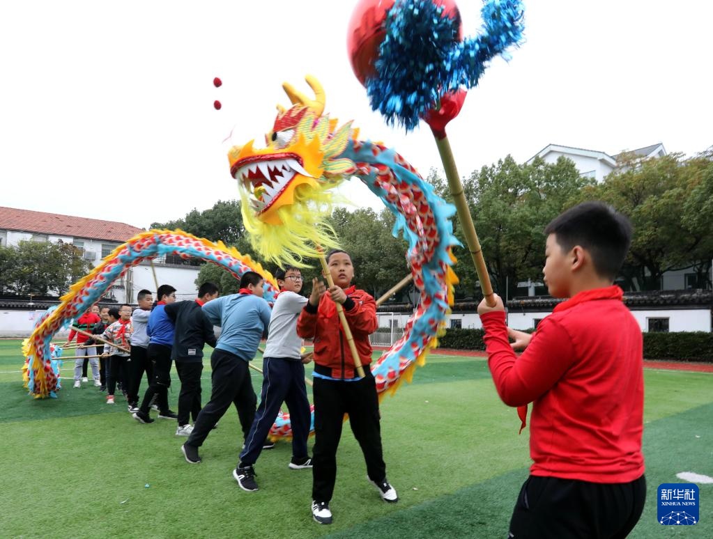 11月4日,江苏省苏州市昇平实验小学校的学生在进行舞龙训练。今年秋季开学以来,江苏省苏州市昇平实验小学校积极落实“双减”政策,注重发展学生兴趣爱好,丰富学生校园生活。其中,校园舞龙学生社团受到学生们的欢迎,舞龙训练在传承和弘扬中华传统文化的同时也帮助学生们强健体魄。新华社发(杭兴微摄)