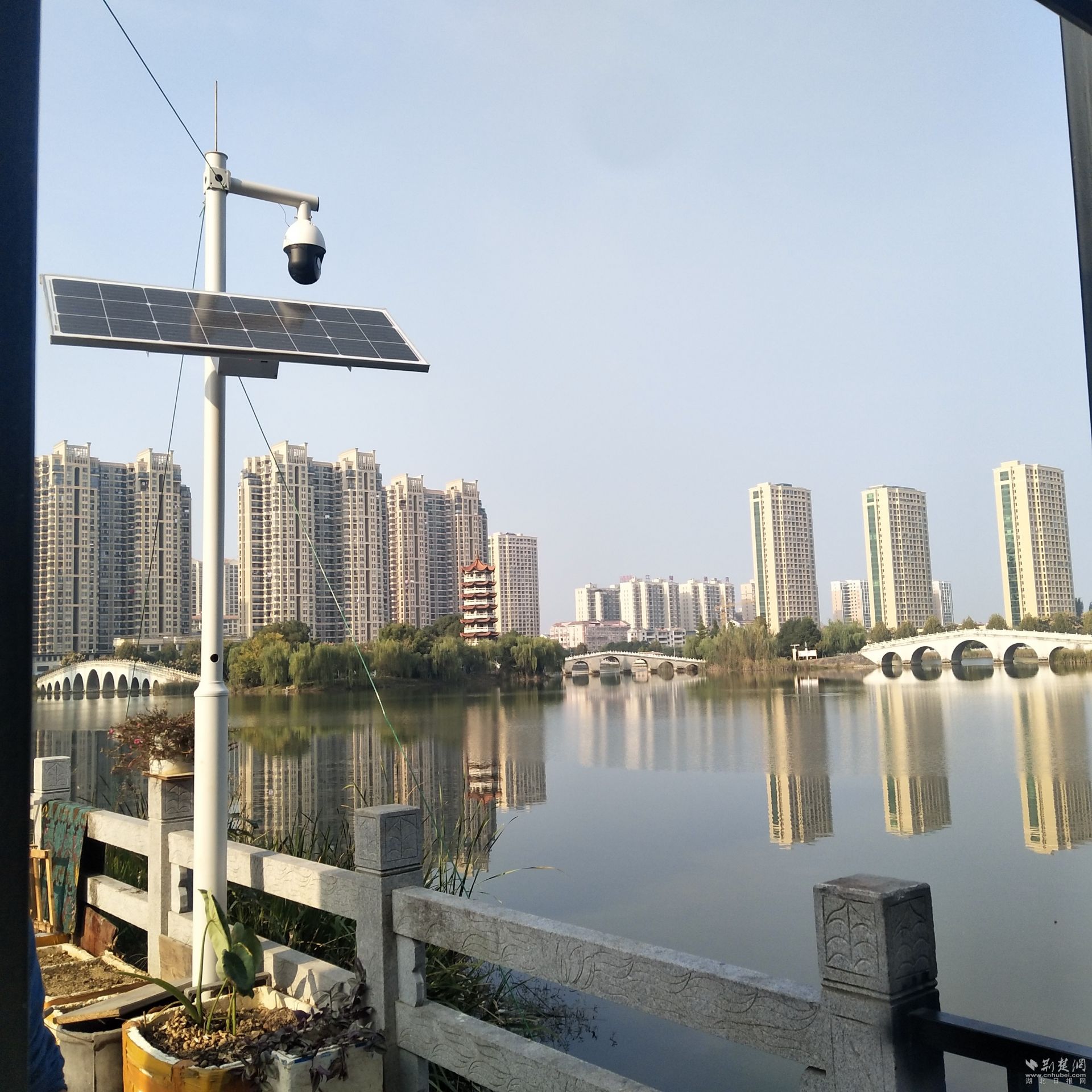 荆楚网(湖北日报网)讯(通讯员黄敏)11月3日,笔者在云梦县梦泽湖看到,由高清摄像头、立杆、太阳能供电系统等组成的视频监控站,像守卫湖泊的卫士,在秋天的阳光下,熠熠生辉。