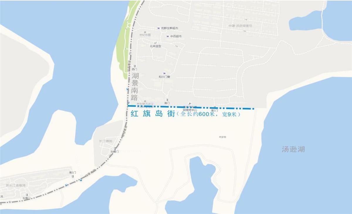 位于江夏区大桥现代产业园辖区。东西走向,西起湖景南路,东至汤逊湖畔。全长约600米,宽约9米。沥青路面。因位于红旗岛,故名。