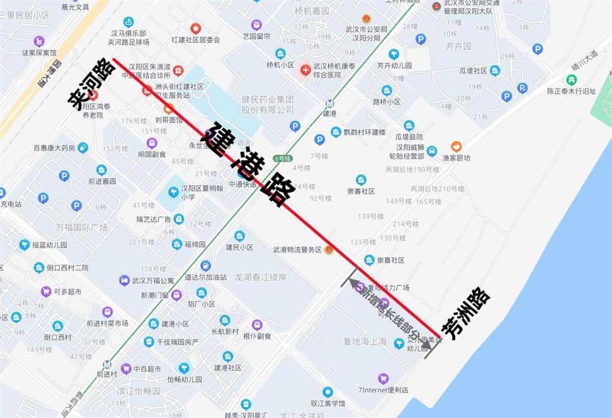 地处汉阳区洲头街道办事处辖区,新港西路东北,紧邻复地·海上海小区东北侧,东南起芳洲路,西北至晴川大道。长约300米,宽约20米。因该道路为已命名的“建港路”向东南端延长线,为保持道路连续性,故名。延伸后,该道路西北起于夹河路,东南止于芳洲路,全长约1200米,宽约20米。