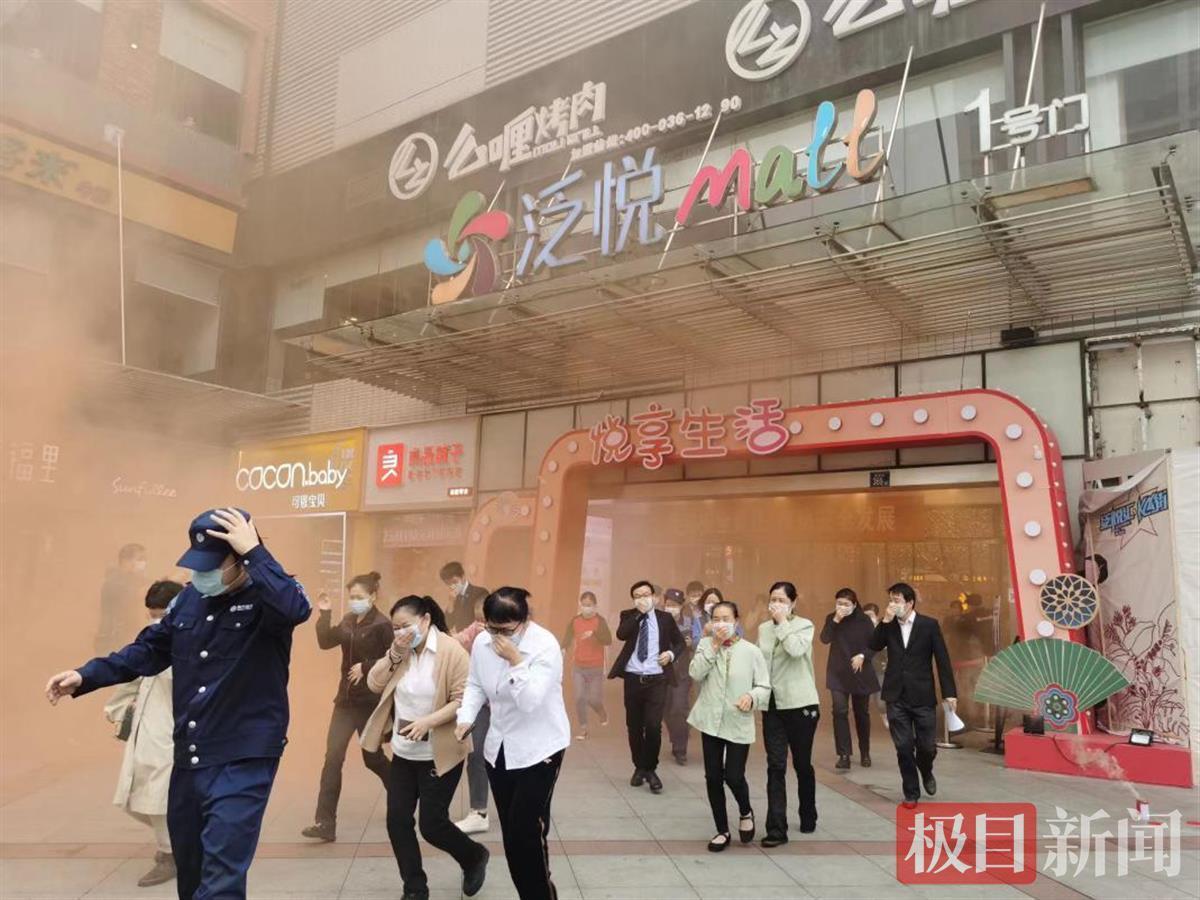 演练开始后,浓烟从超市内弥漫出来,广播响起“请迅速疏散到安全区域”的提醒,商超内的顾客捂着口鼻,有序疏散到广场上。