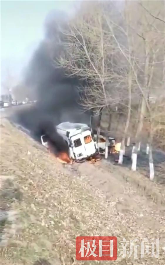多位目击者发布的视频显示,事发公路路面干燥,旁边小树林里有一辆白色的小客车和一辆小轿车挨在一起,两车均在起火,并冒出滚滚浓烟,路边还有一个轮胎。