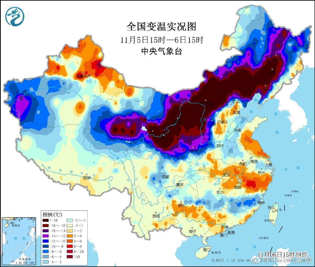 北方已大范围强降温,深红色区域降幅基本超过20℃