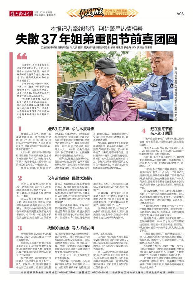 今年7月底,武汉市黄陂区居民杨宝林向极目新闻《帮到底》栏目求助:“母亲张红英年纪大了,想找失联37年的弟弟,这两年一直在念叨这个事。”作为当天的热线值班记者,我迅速驾车赶到黄陂采访。张红英老人今年67岁,老家在四川省合川县(现重庆合川区),后来到湖北省黄陂县(现武汉市黄陂区)务工,再也没回过老家,1984年与亲人失去联系。老人不识字,我和杨宝林根据她的回忆,将相关的姓名、年份、地点等细节一一梳理。(点击查看报道)