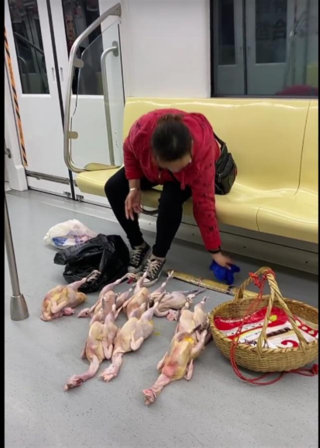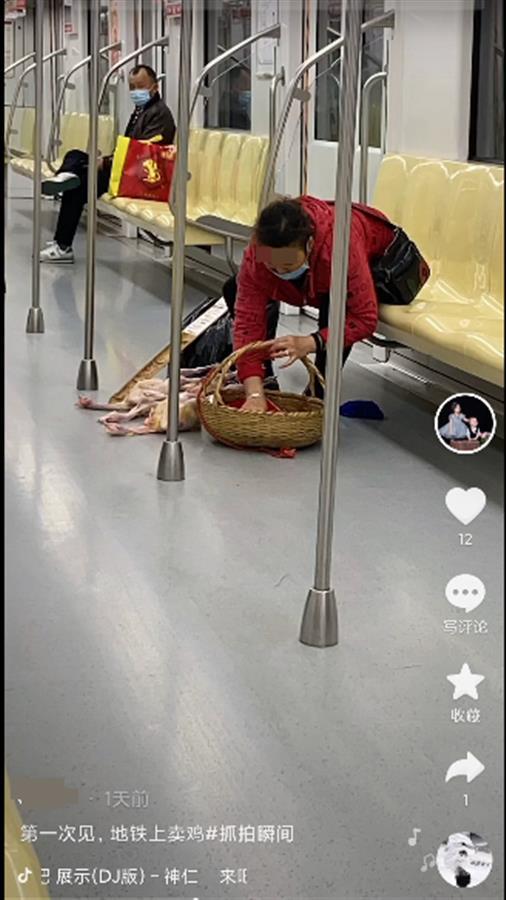 一段网络视频显示,一列地铁车厢内,一名身穿红色衣服的中年女子从携带的篮子里取出八只宰杀好的整鸡,摆放在身前的地面上。女子的行为引来其他乘客的侧目关注,视频所配文字称,“卖鸡喽,来吧,展示。”