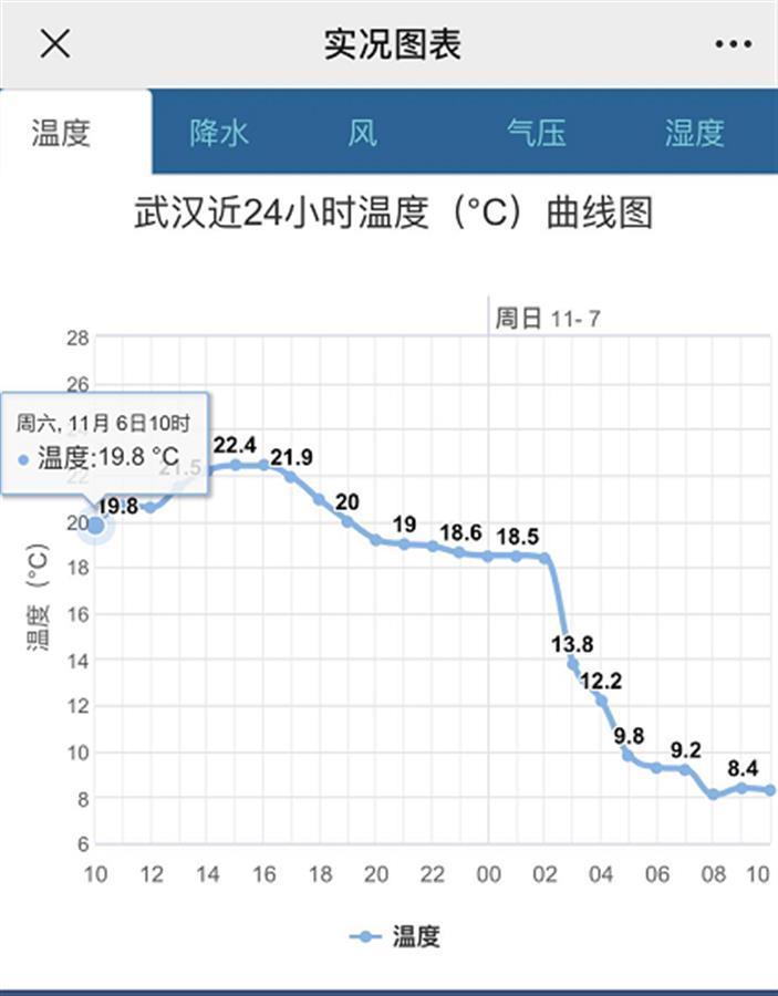 气象监测数据显示,武汉气温的速滑速降是从凌晨2时开始的,2时气温还有18.4℃,凌晨3时降至13.8℃,凌晨4时12.2℃,凌晨5时只有9.8℃。