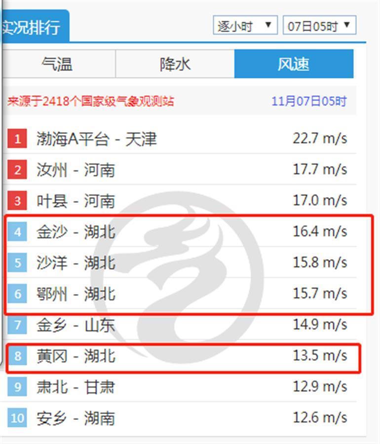 截至上午10时,全国2418个国家级气象观测站逐小时排行榜,从凌晨3时至上午9时的每个小时中,都有湖北地区的风力占据全国排行前十:凌晨3时,沙洋风速13.6米/秒位居第6;凌晨5时,金沙(16.4米/秒)、沙洋(15.8米/秒)、鄂州(15.7米/秒)、黄冈(13.5米/秒)分别位居第4、5、6、8;清晨7时和,鄂州(15.4米/秒)、金沙(15.1米/秒)、沙洋(13.5米/秒)和襄阳(13.1米/秒)分别位居第3、5、8和9。